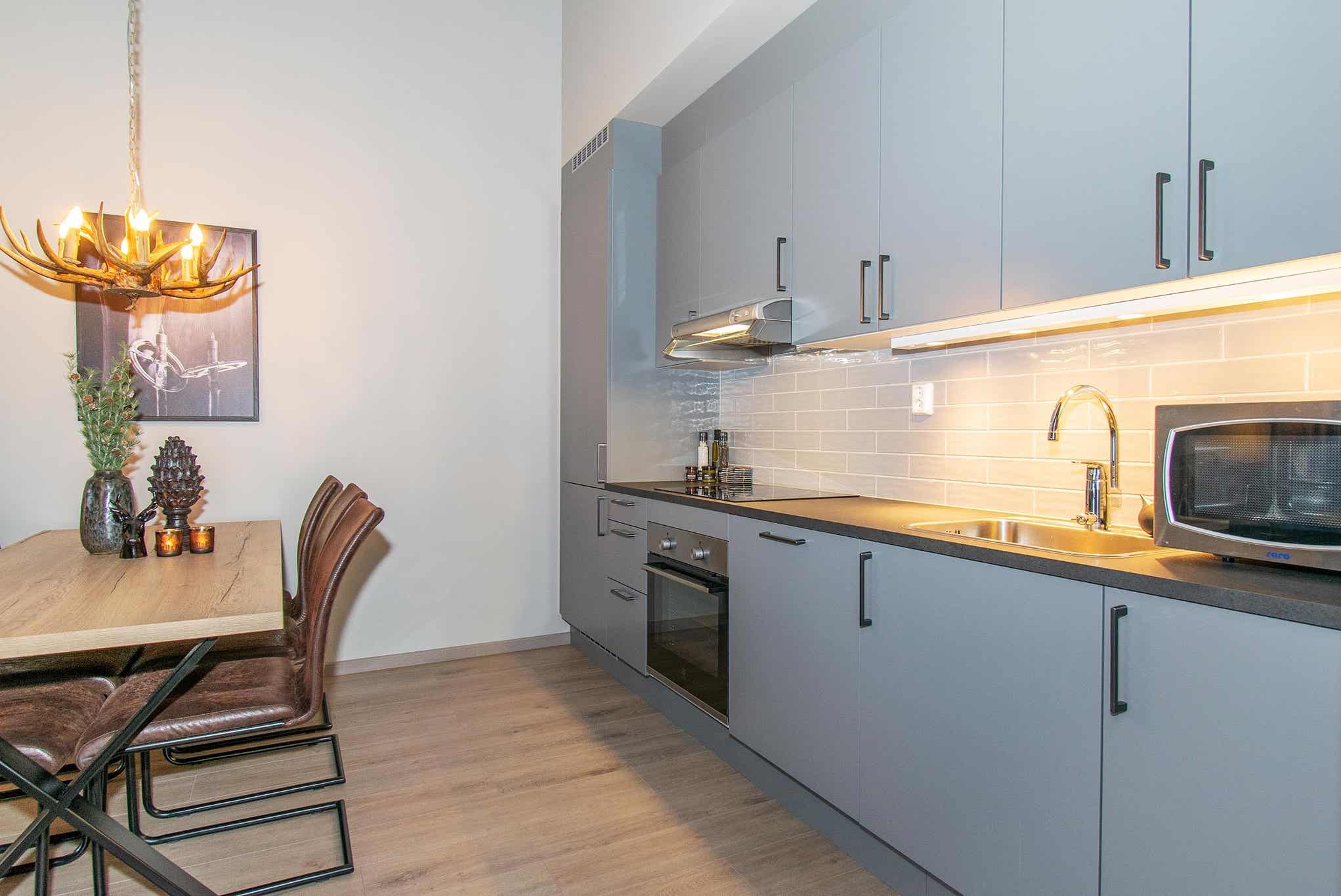 De unit heeft een magnetron, vaatwasser, koelkast, vriezer.