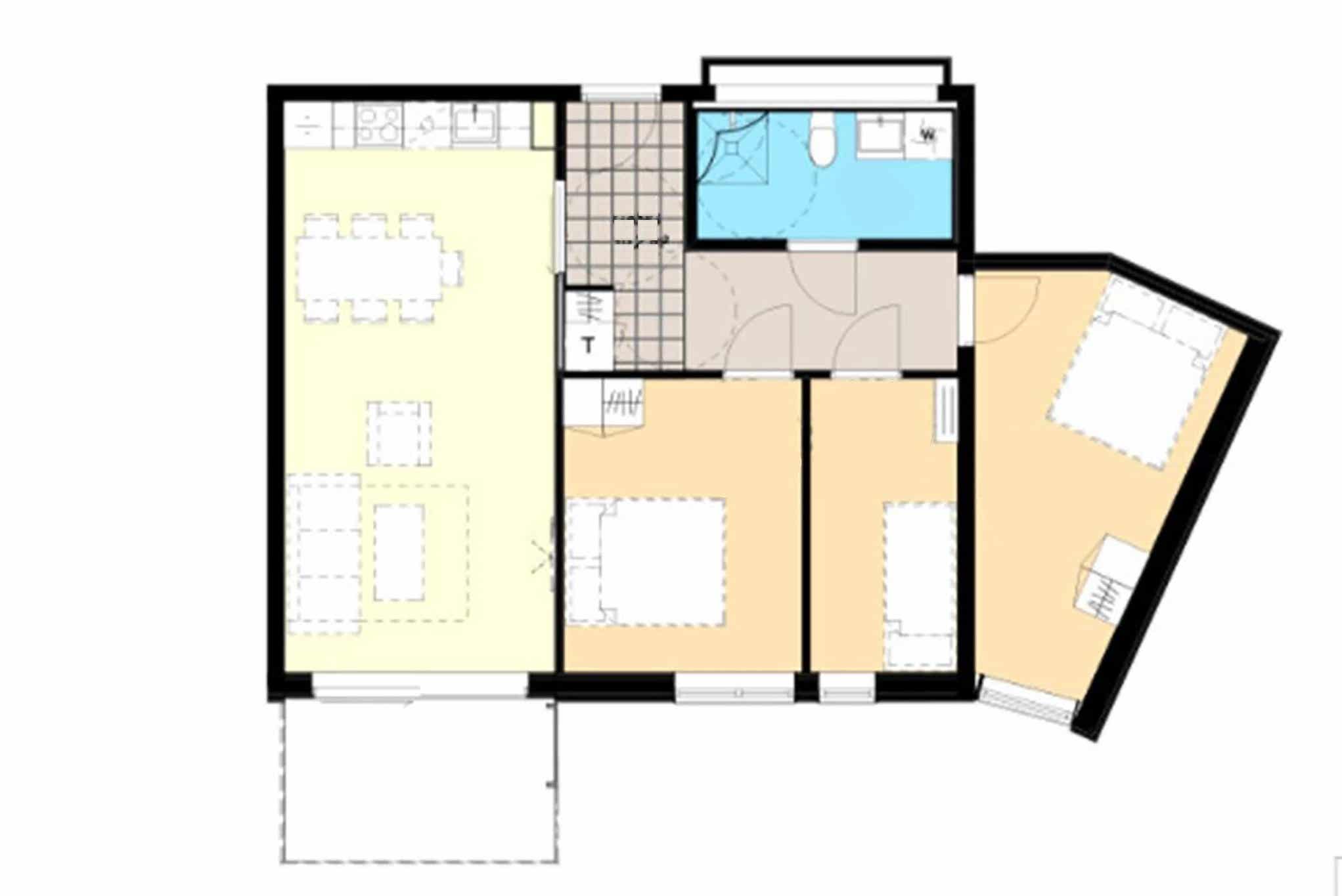 Appartement op de vierde verdieping, 7 bedden, 74 m², woonkamer met gecombineerde keuken, 3 slaapkamers, 1 douche, 1 toilet.