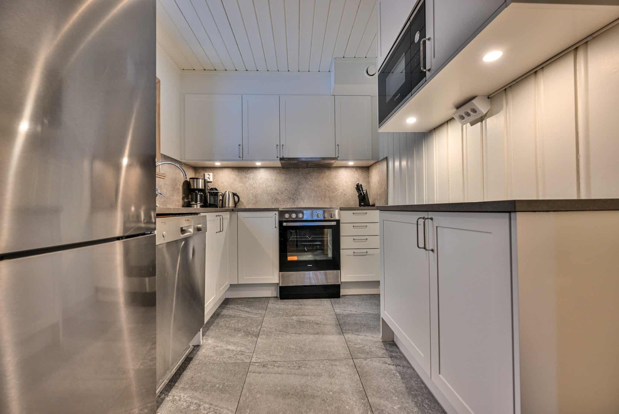 De keuken is voorzien van fornuis met oven, magnetron, vaatwasser, koelkast, vriezer.