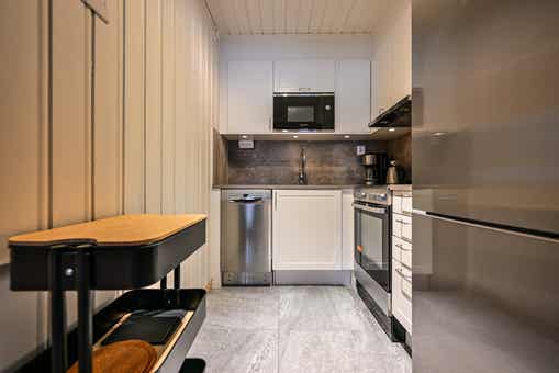 De keuken is voorzien van fornuis met oven, magnetron, vaatwasser, koelkast, vriezer.