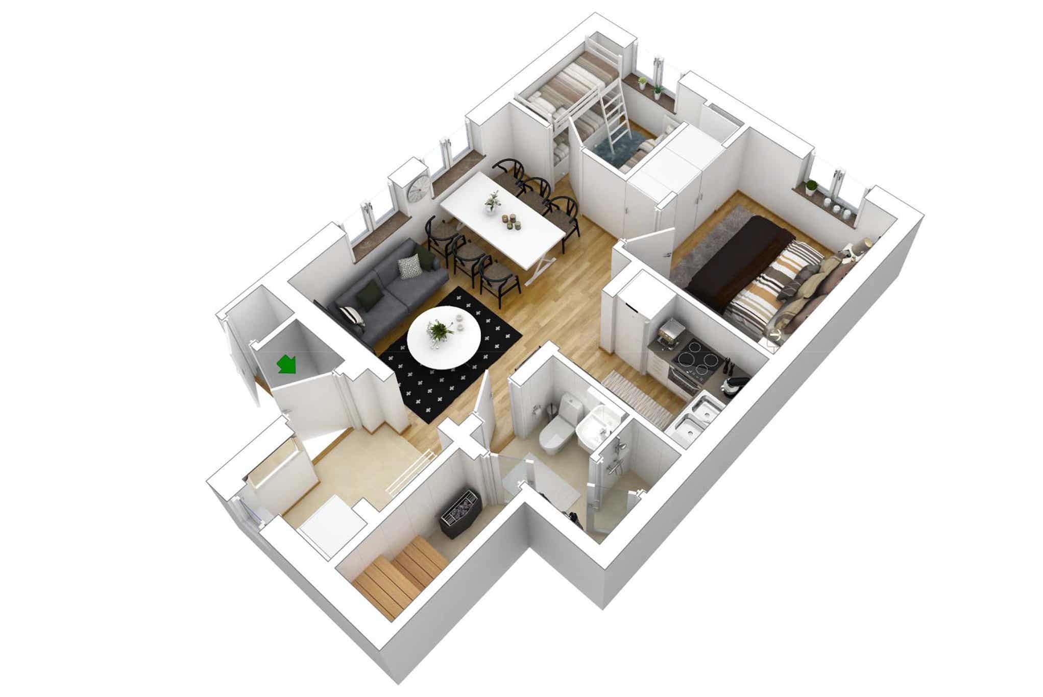 Timmerbyn ligt in Lindvallen. Appartement, 4+1 bedden, 46 m², woonkamer met gecombineerde keuken, 2 slaapkamers, 1 douche, 1 toilet, sauna.