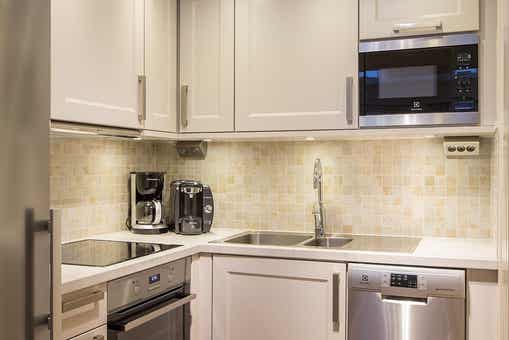 De keuken is voorzien van fornuis met oven, magnetron, vaatwasser, koelkast, vriezer.