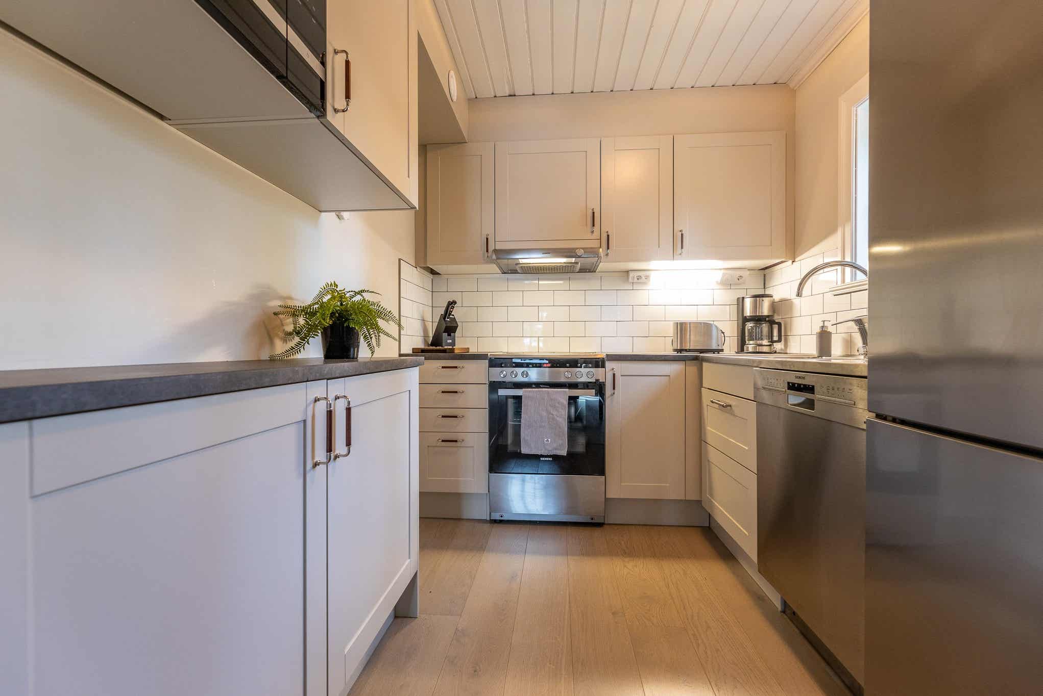 De keuken is voorzien van fornuis met oven, vaatwasser, magnetron, koelkast, vriezer.