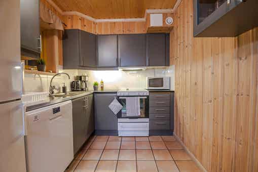 De keuken is voorzien van fornuis met oven, magnetron, vaatwasser, koelkast, vriezer.