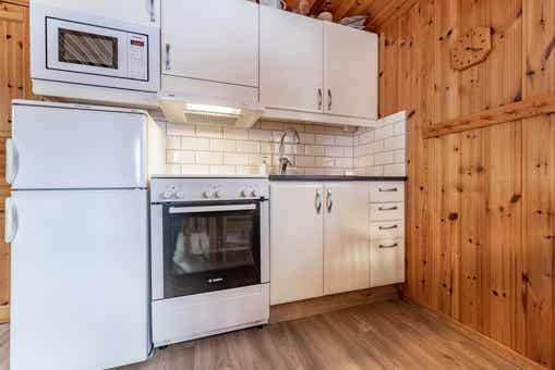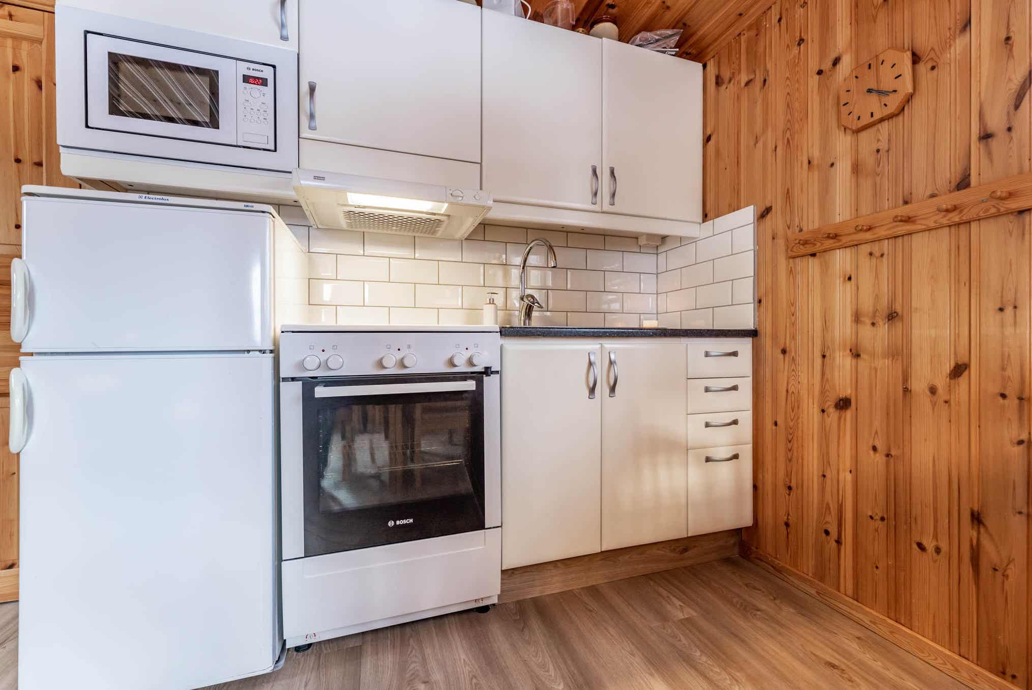 De keuken is voorzien van een elektrische kookplaat, koelkast, magnetron.