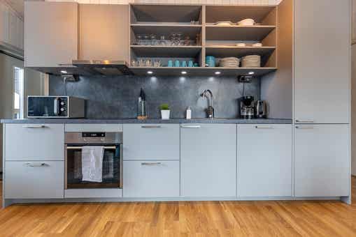 De keuken is voorzien van elektrische kookplaat, inbouwoven, koelkast, vriezer, vaatwasser, magnetron.