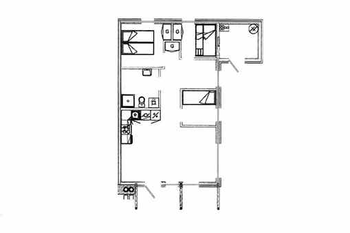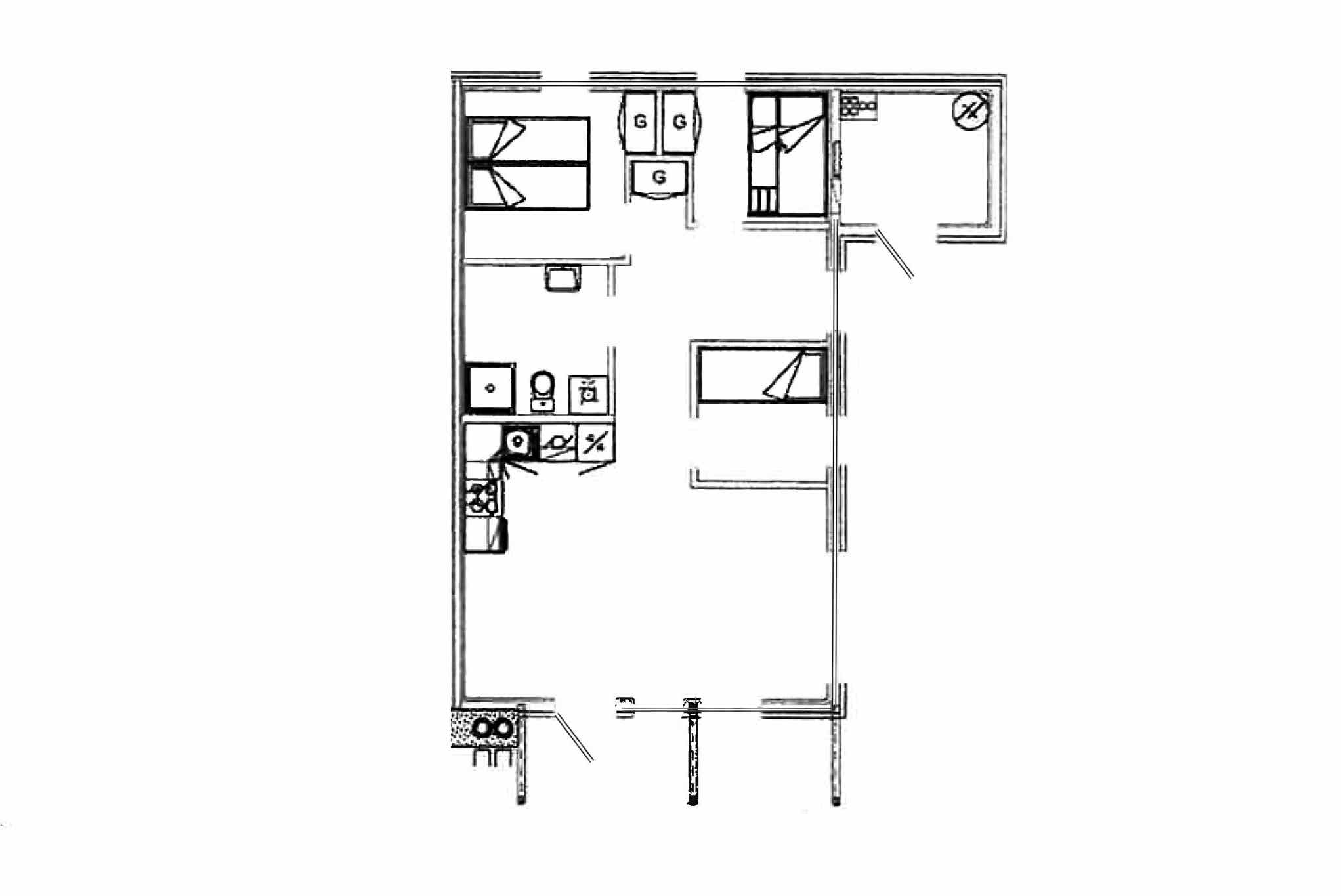 Appartement op de eerste verdieping, 6 bedden, 56 m², woonkamer met gecombineerde keuken, 3 slaapkamers, 1 douche, 1 toilet.