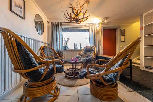 Woonkamer met relax op de begane grond, keuken met eethoek op de eerste verdieping.