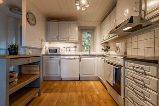 De keuken is voorzien van fornuis met oven, koelkast, vriezer, vaatwasser, magnetron.