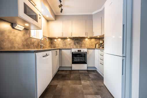 De keuken is voorzien van fornuis met oven, koelkast, vriezer, vaatwasser, magnetron.