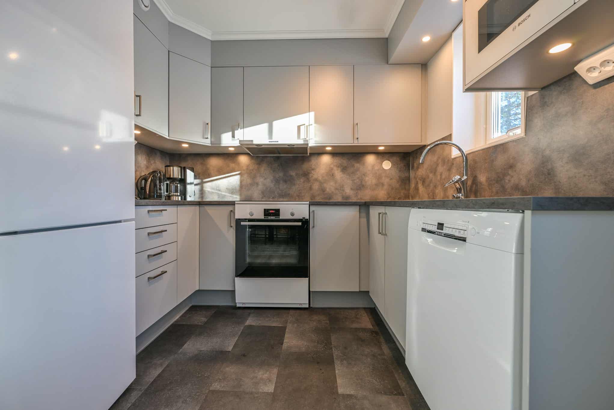 De keuken is voorzien van fornuis met oven, koelkast, vriezer, vaatwasser, magnetron.
