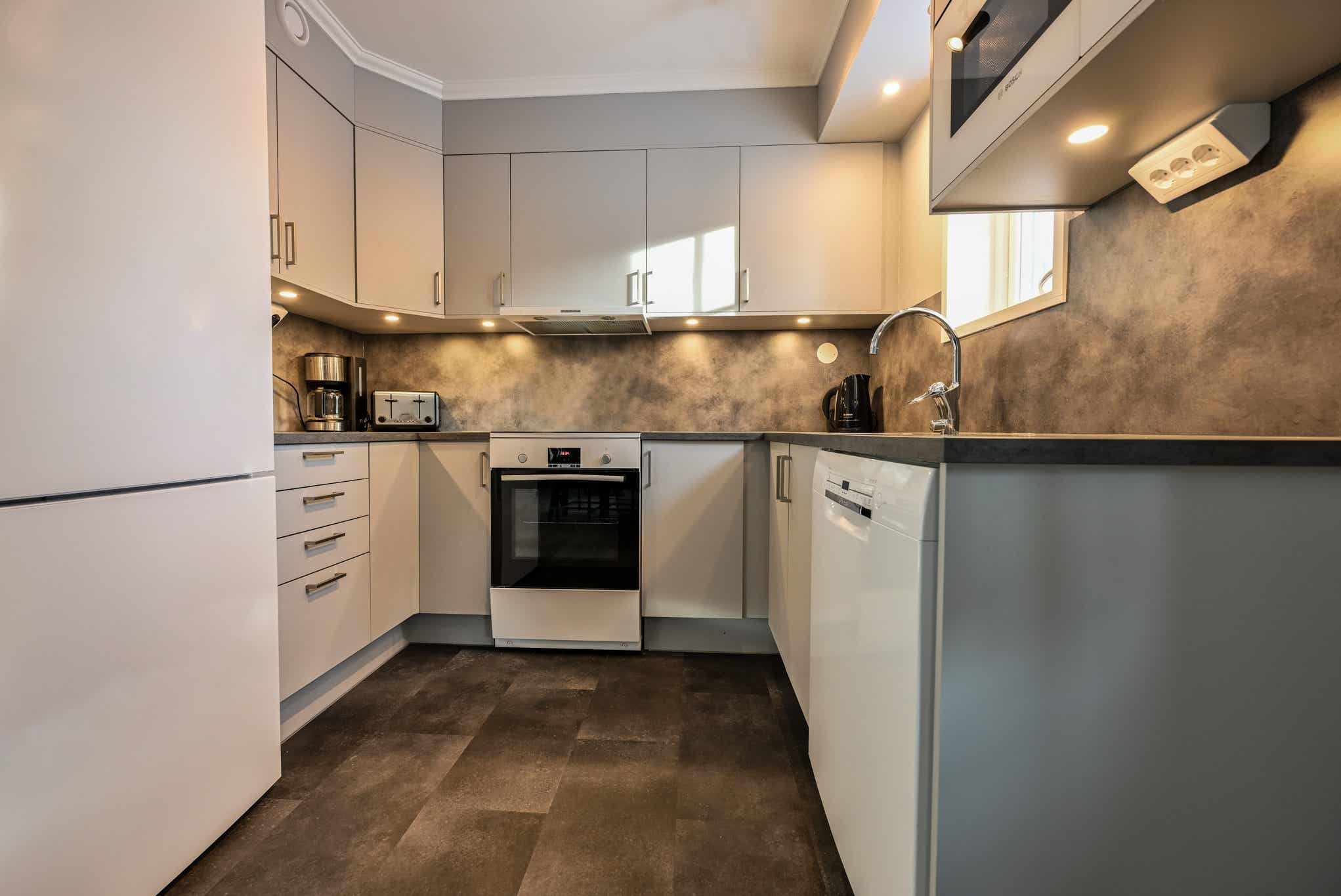 De keuken is voorzien van fornuis met oven, koelkast, vriezer, vaatwasser, magnetron.