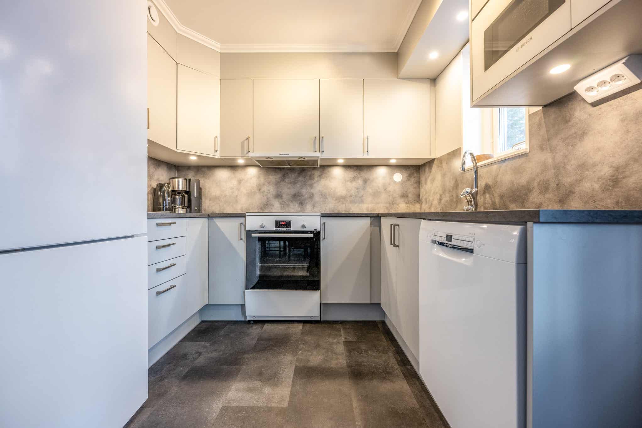 De keuken is voorzien van fornuis met oven, koelkast, vriezer, vaatwasser, magnetron.
