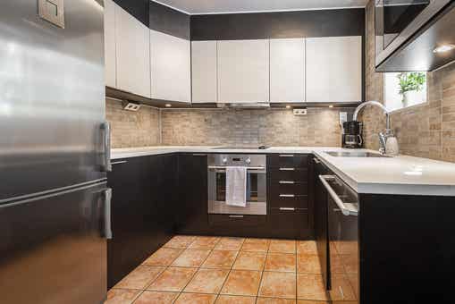De keuken is voorzien van fornuis met oven, koelkast, vriezer, vaatwasser, magnetron.