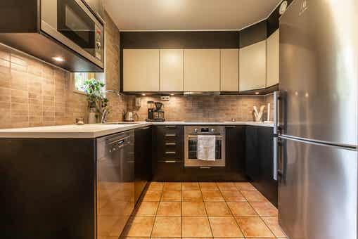 De keuken is voorzien van fornuis met oven, koelkast, vriezer, vaatwasser, magnetron.
