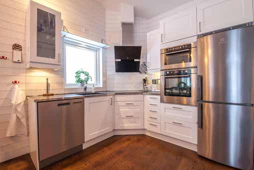 De keuken is voorzien van elektrische kookplaat met oven, koelkast, vriezer, vaatwasser, magnetron.