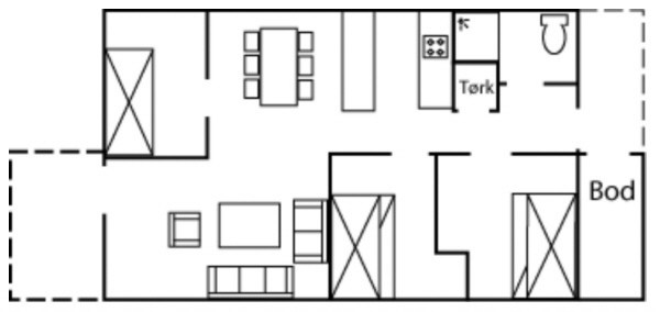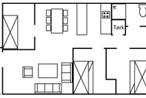 Vrijstaand huisje, 6 bedden, 56 m², woonkamer met gecombineerde keuken, 3 slaapkamers, 1 douche, 1 toilet.