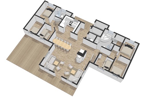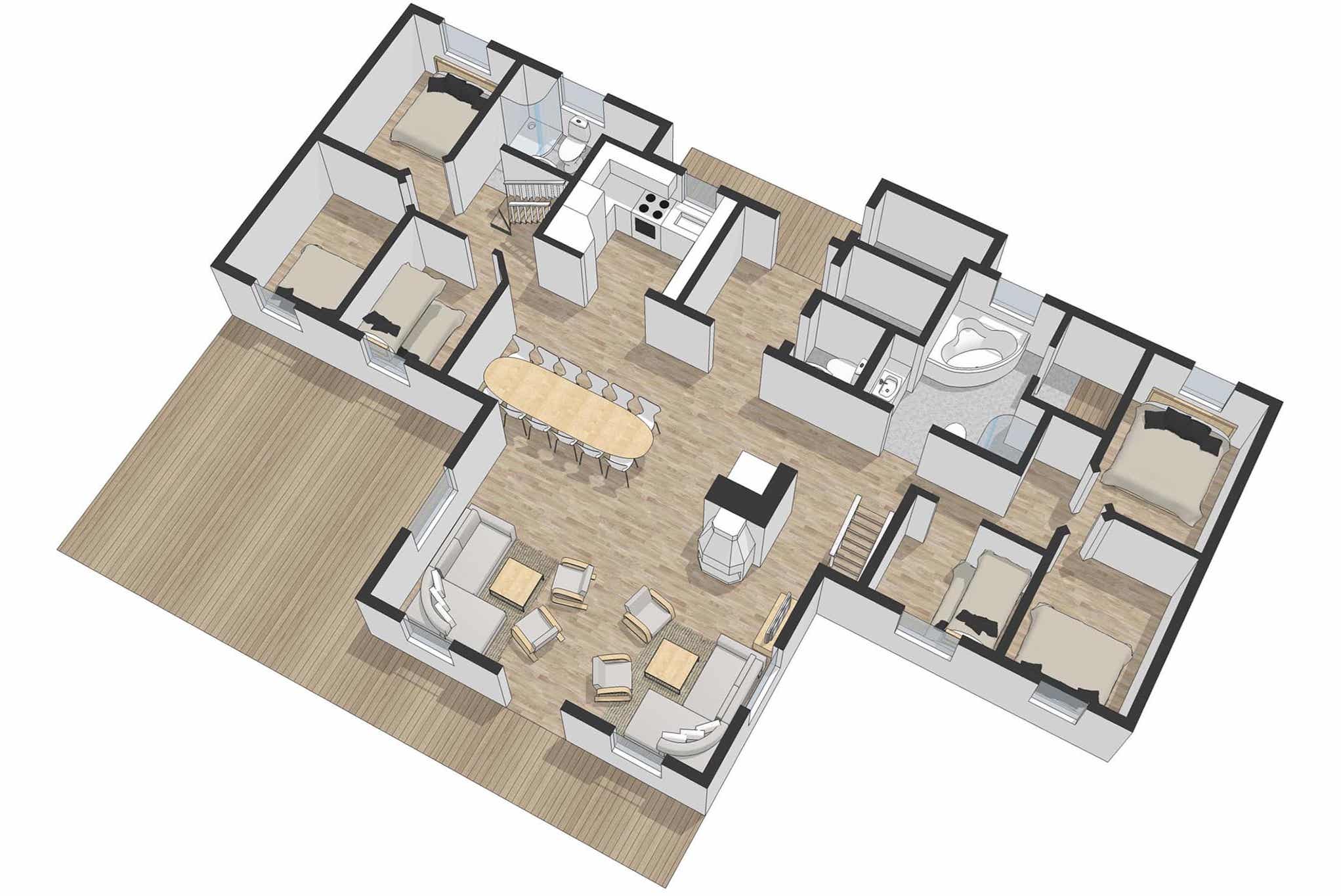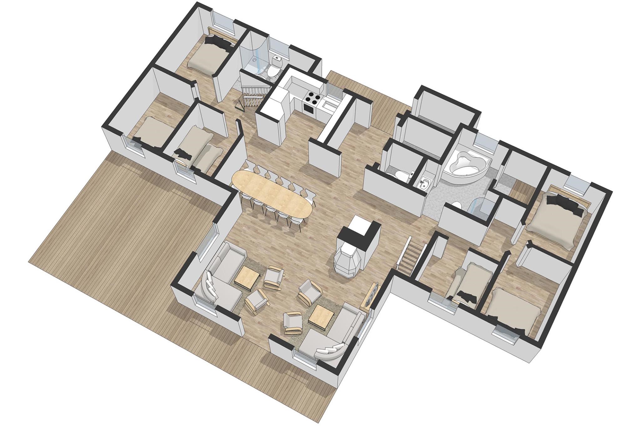Vrijstaand huisje, 20 bedden, 211 m², woonkamer met gecombineerde keuken, 8 slaapkamers, 2 douches, 3 toiletten, 1 sauna, bubbelbad.
