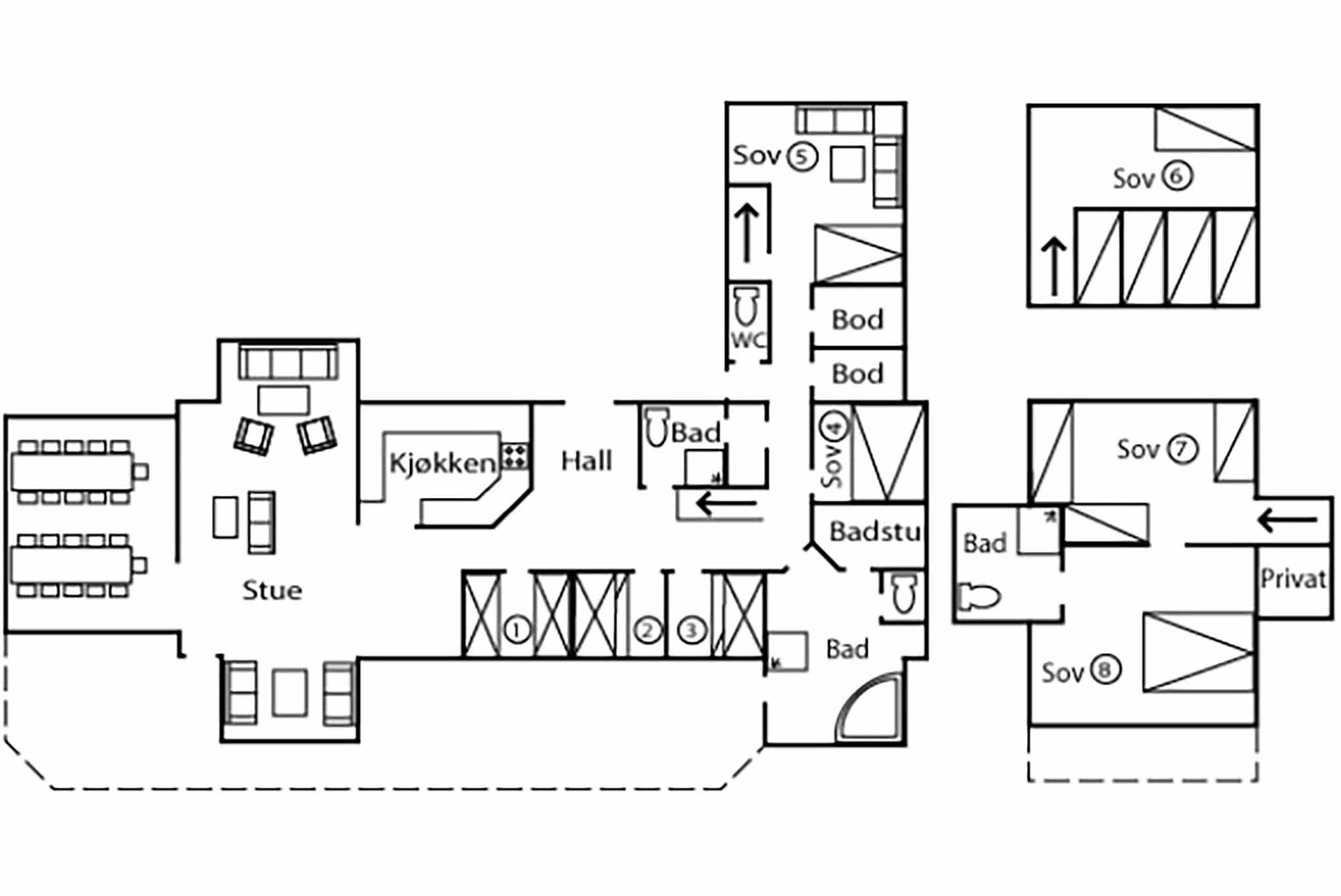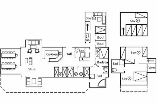 Vrijstaand huisje met vide, 14+6 bedden, 320 m², woonkamer met gecombineerde keuken, 6 slaapkamers, 3 douches, 4 WC, 1 sauna, bubbelbad.
