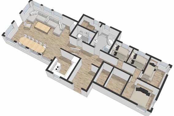 Slaapkamers:Slaapkamer 1= 1 tweepersoonsbed. Slaapkamer 2= 1 tweepersoonsbed. Slaapkamer 3= 1 stapelbed met 150 cm breed onderbed. Slaapkamer 4= 1 stapelbed met 150 cm breed onderbed. Slaapkamer 5= 1 stapelbed met 120 cm breed onderbed. Slaapkamer 6= 1 stapelbed met 120 cm breed onderbed. Slaapkamer 7= 1 stapelbed.