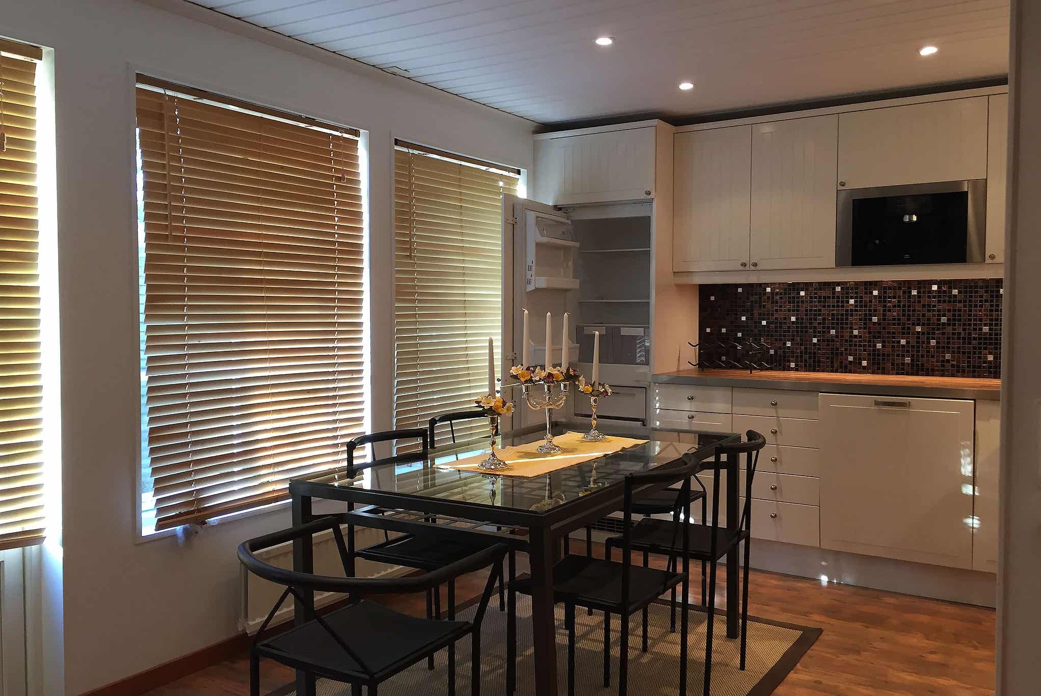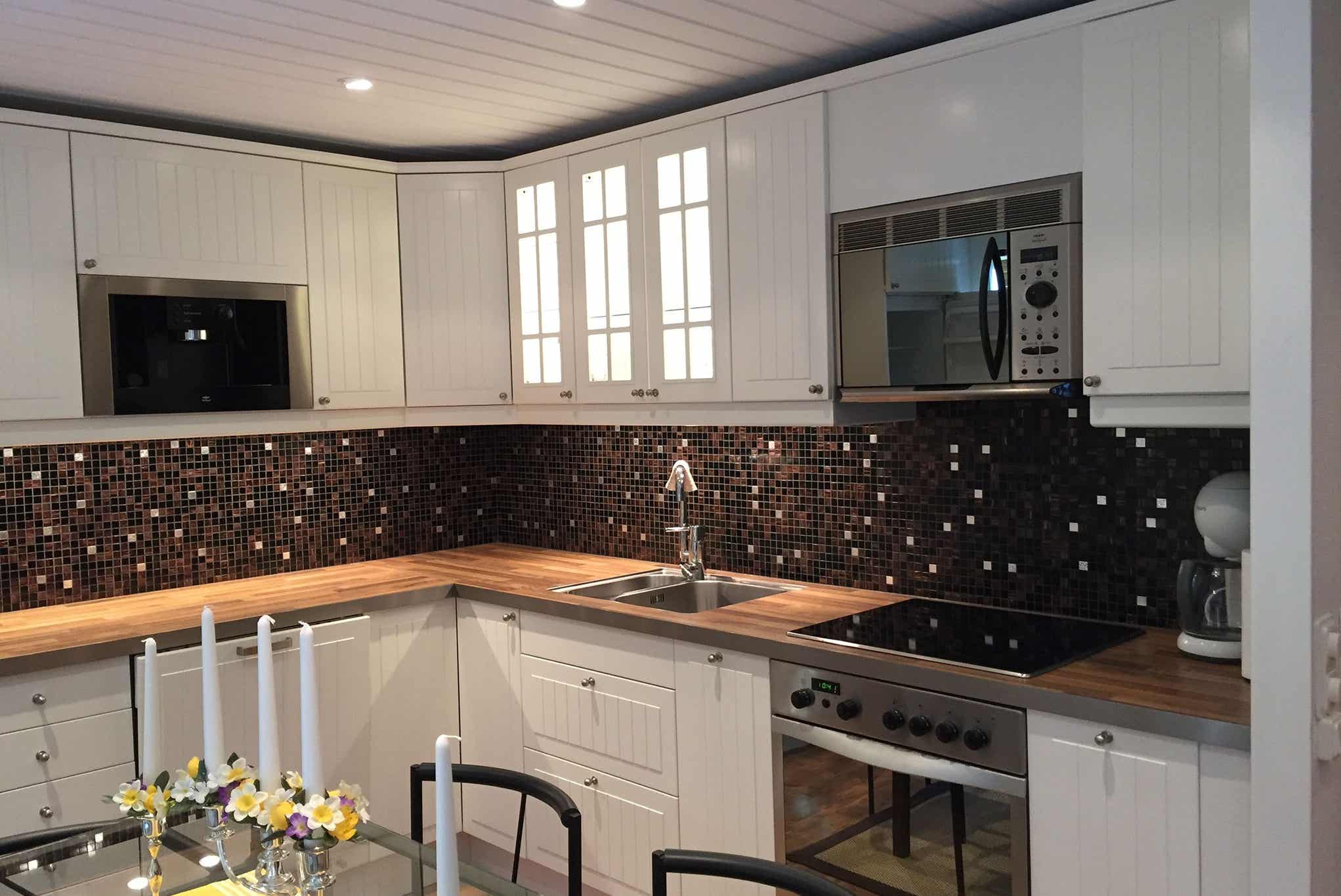 De keuken is voorzien van fornuis met oven, koelkast, vriezer, vaatwasser, magnetron.