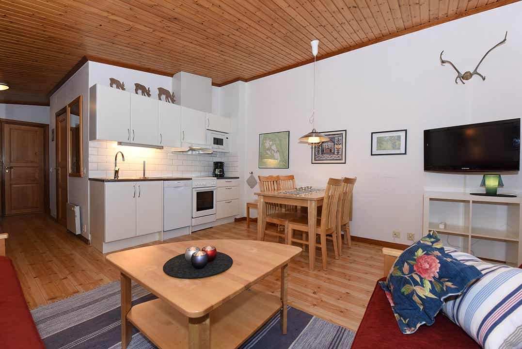 Högfjällsbyn bevindt zich in Högfjället. Appartement op de tweede verdieping, 4+1 bedden, 42 m², woonkamer met gecombineerde keuken, 2 slaapkamers, 1 douche, 1 toilet, sauna.