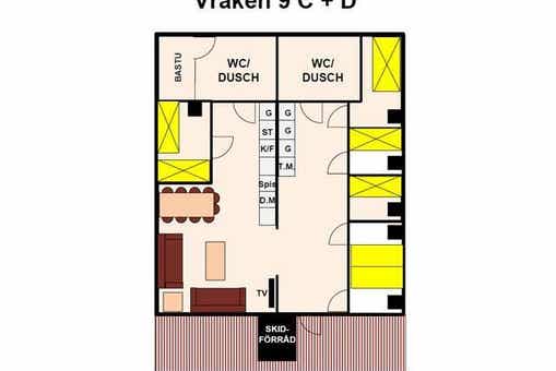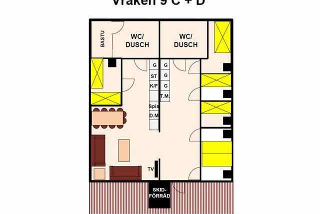 Högfjällsbyn bevindt zich in Högfjället. Appartement op de begane grond, 9 bedden, 84 m², woonkamer met gecombineerde keuken, 4 slaapkamers, 2 douches, 2 toiletten, sauna.