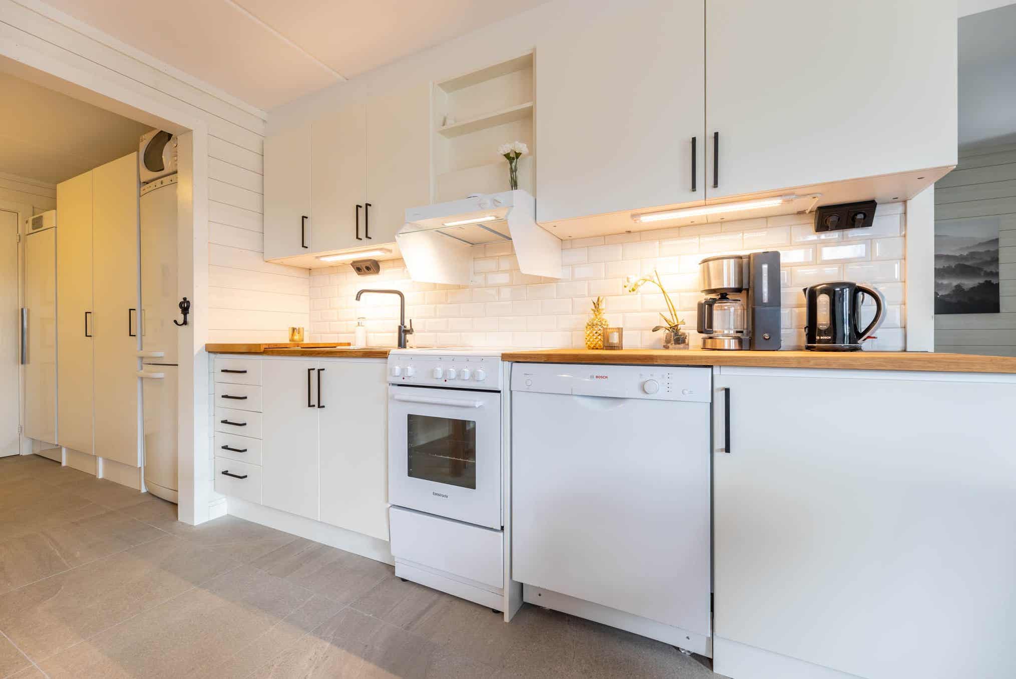 De keuken is voorzien van elektrische kookplaat met oven, koelkast, vriezer, vaatwasser, magnetron.