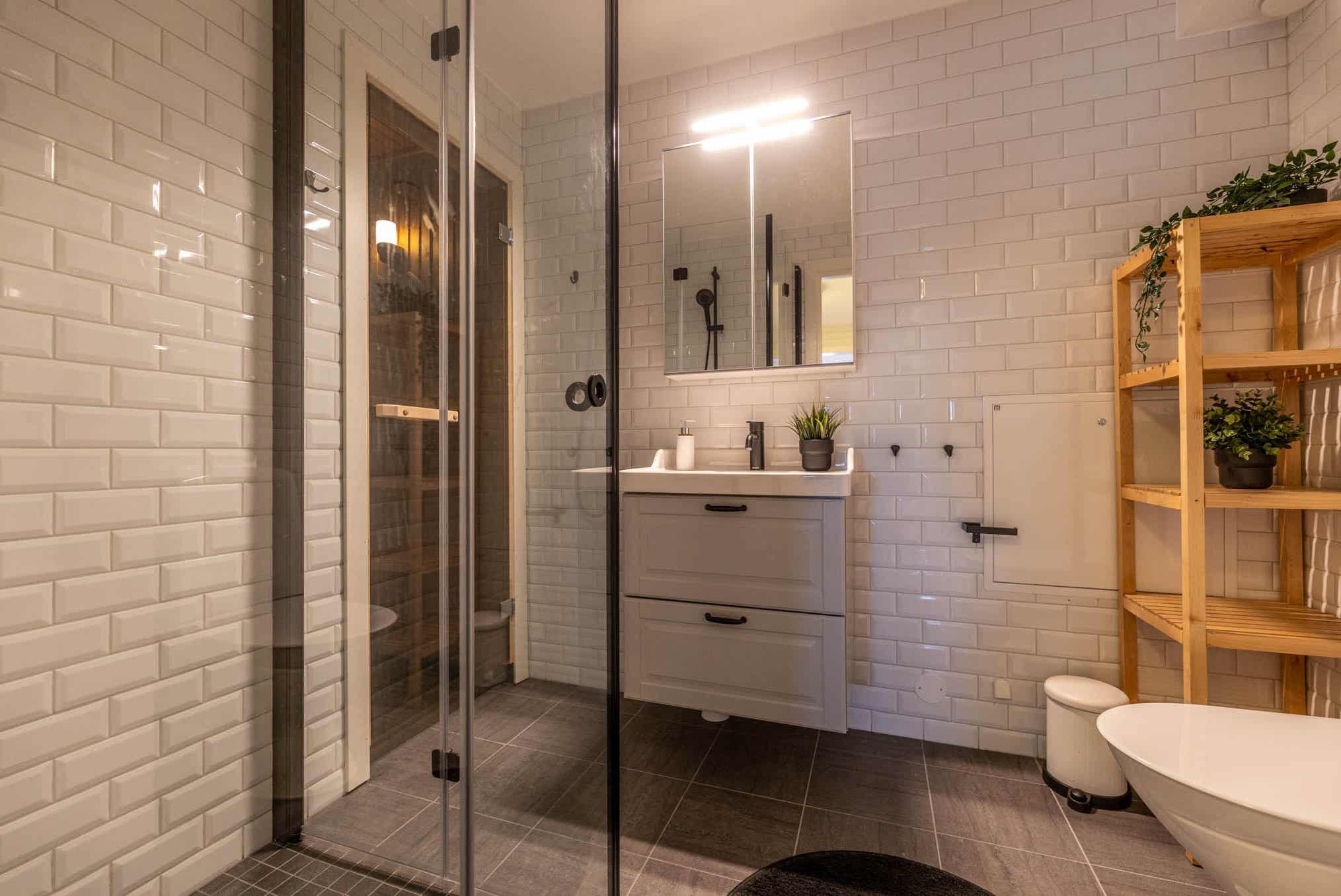 Badkamers:Badkamer 1: met douche/WC/sauna. Badkamer 2: met douche/WC.